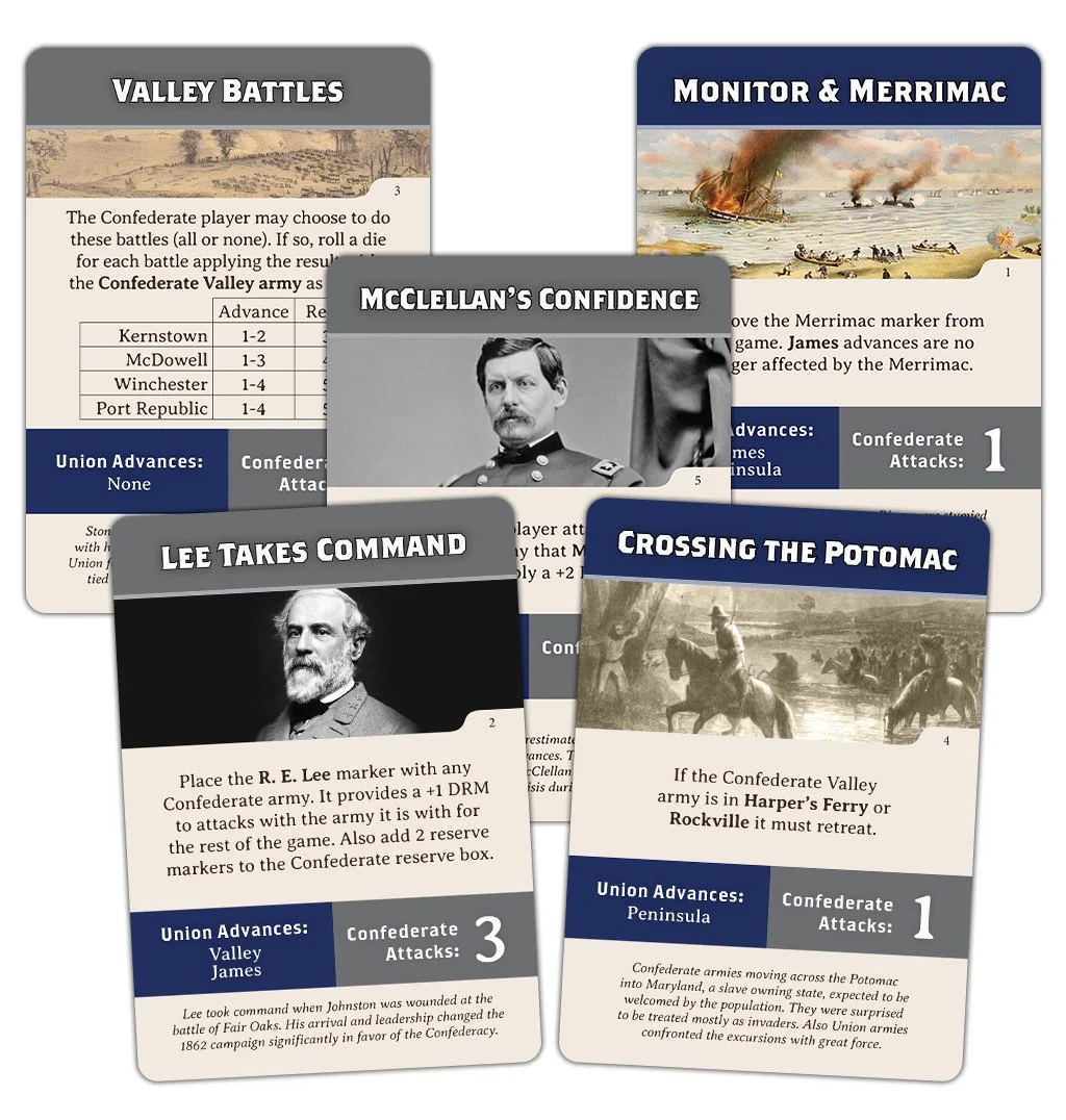 1862 War in Virginia is a solitaire game on the Civil War campaigns in Virginia. You take the role of the Confederates against a card driven Union Artificial Intelligence (AI) player to determine the outcome of the Civil War in 1862.